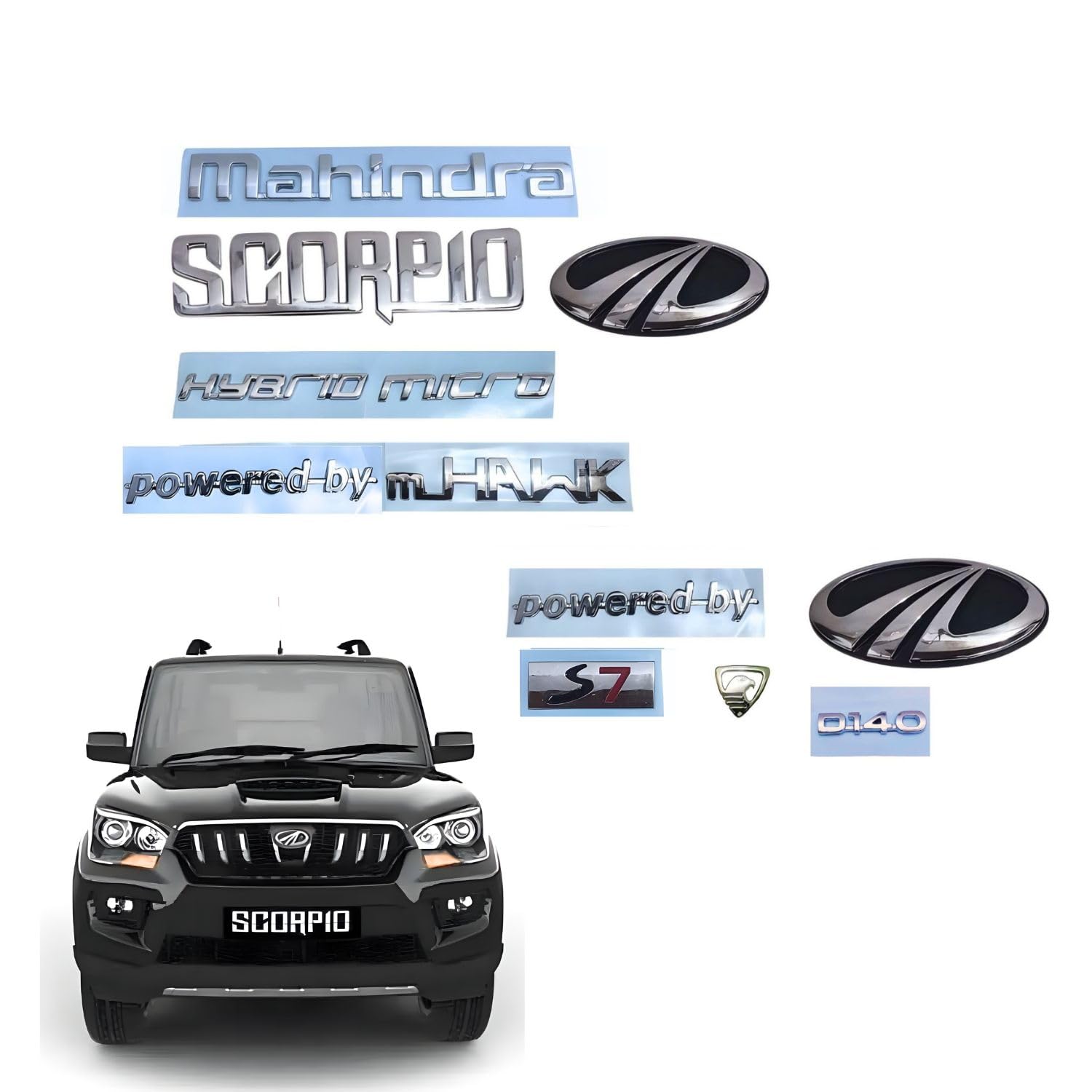 SKM Car Scorpio S7, D140 Hybrid Micro, Powered by MHAWK Nameplate Emblem Badge Kit Set with Front & Rear Logo